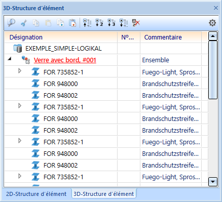 Le nom du projet (ici par exemple "Grille_01") et le numéro de position (identifié par # qui le précède) de LogiKal seront affichés dans la structure d'élément de HiCAD :