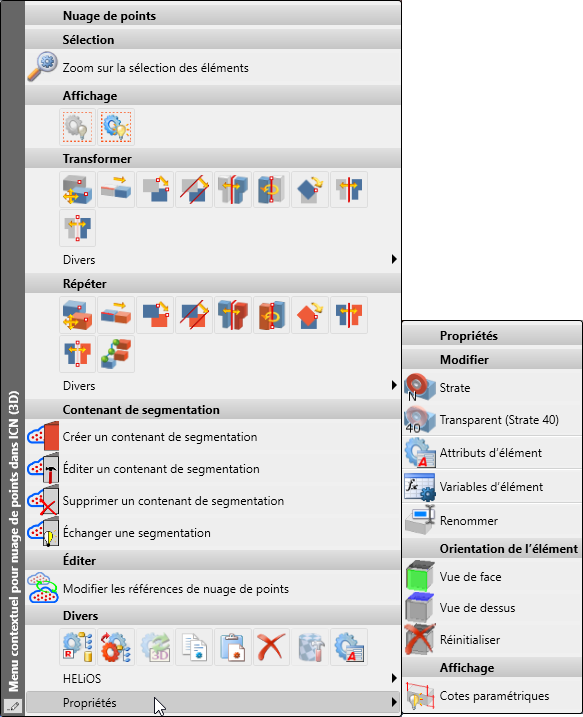 À l’instar des autres éléments, les nuages de points peuvent eux aussi être transformés, répétés et référencés dans HiCAD et gérés depuis HELiOS (ou autre). Vous pouvez afficher le menu contextuel pour Nuages de points en effectuant un clic droit sur un nuage de points depuis le Navigateur ICN.