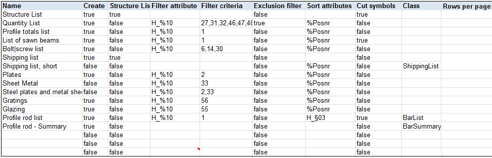 false, this table sheet will be ignored.true, the Report Manager data will be used for structure lists and the special structure list formatting will be applied. false here, only rows fulfilling the criteria will be output; if you select true, only rows will be output that do not fulfil the criteria. H_%101,2falseH_%1055true%Stufe1,2falseIf you want to apply several filters (e.g one inclusion filter and one exclusion filter), create another row in the table, in which only the values Name (must be identical with the previous row), Filter attribute, Filter criteria and Exclusion filter are set.