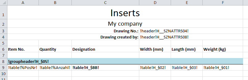 In the header area we will enter the title and the name of our company. These inputs are static values, i.e. they can simply be entered manually there. The drawing number and the name of the drawing creator are to be dynamic values. Since these values are to appear in the header area, we will use the format !header!XYZ - i.e. !header!H__SZNATTRS04! for the drawing number and !header!H__SZNATTRS08! for the drawing creator: