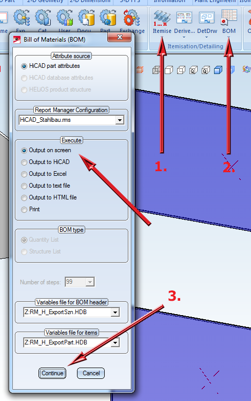 Start HiCAD and open or create a new drawing with a couple of suitable parts. Itemize the parts as usual (1.) and display the BOM in the Report Manager (2., 3.).