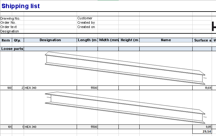 Another worksheet has been added to the Excel template HiCAD_Stahlbau: Shipping list, short, with image. It contains the same information as Shipping list, short, but additionally contains a picture of the parts.