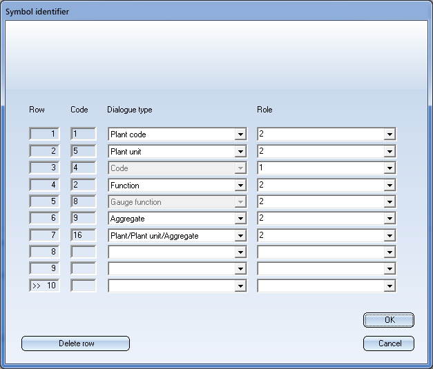 Here you can select several attributes (dialogue types) serving as symbol uniqueness. 1 in the Role column stands for the main dialogue type, 2 for sub-dialogue type. Up to 10 dialogue types can be defined here. Please note that greyed out dialogue types cannot be removed with the Delete row function. During insertion or editing of a symbol these attributes will be checked for uniqueness, if the