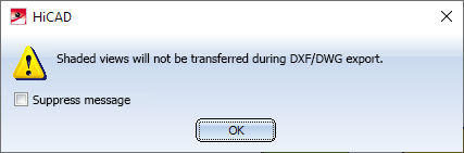 The DXF export only outputs vector graphics (e.g. glass model or HiddenLine), but not shaded or pixel graphics. If the model drawing or the selected section contains shaded 3-D models, a corresponding message will be displayed: