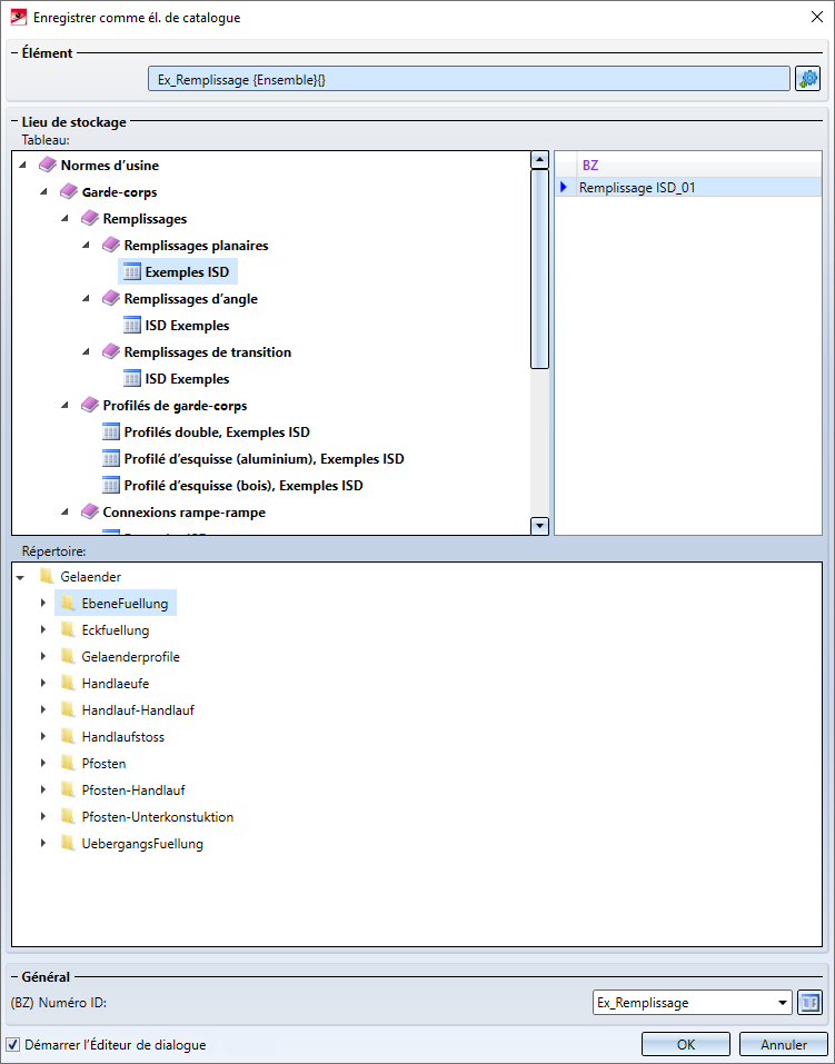 À l'aide de cette fonction, vous pouvez sauvegarder des composants de garde-corps spécifiques au client comme variante. Un prérequis est d'avoir construit un composant de garde-corps correspondant et de l'avoir paramétré, ainsi que d'avoir spécifié un système de coordonnées d'insertion pour la variante.