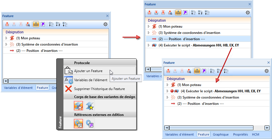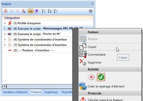 • Dans votre variante, vous devez insérer un script Feature particulier : Exécuter le script - Abmessungen HH, HB, EX, EY. Pour ce faire, chargez une variante d'exemple de ISD contenant ce script, par exemple la variante poteau : Profilé d'esquisse (Normes d'usine > Garde-corps > Poteaux).