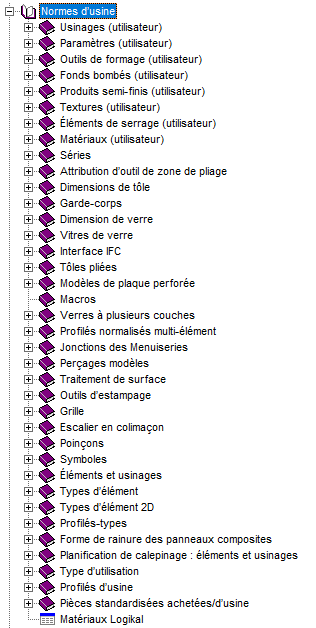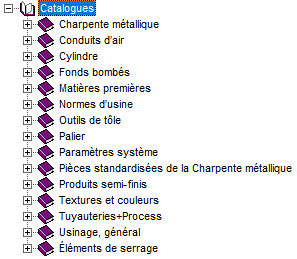 Un sous-dossier spécial du dossier KATALOGE (=Catalogues) est constitué du dossier WERKSNORMEN (=Normes d'usine). Les catalogues spécifiques aux utilisateurs sont stockés ici. Par exemple, vous pouvez enregistrer des éléments, des ensembles ou des profilés types en 2D ou en 3D directement à partir du dessin HiCAD dans des catalogues individuels. Ces catalogues spécifiques à l'utilisateur peuvent être créés, gérés et édités avec l'Éditeur de catalogue. Les paramètres de couleur, les matériaux ou les outils de poinçonnage et d'estampage individuels peuvent être gérés par des catalogues de normes d'usine.