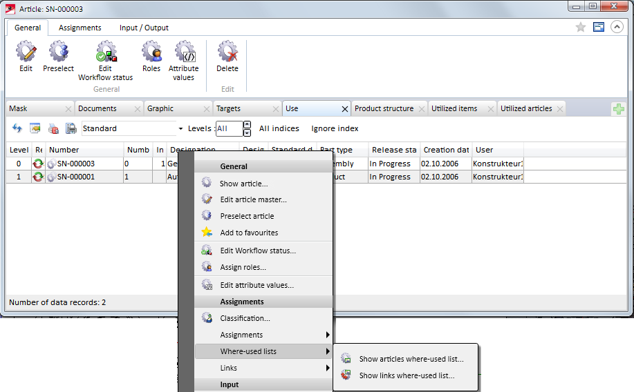 In the Use tab of an article master window, a so-called "articles where-used list" can be displayed. For this purpose, you need to transfer the part structure to the product structure. Please note that only one level will be transferred.