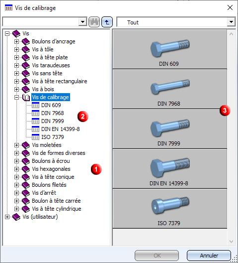 La structure du catalogue se trouve dans la partie gauche de la fenêtre de sélection. Un catalogue peut être sous-répertorier dans d'autres catalogues et contenir dans le niveau inférieur les séries de normes disponibles. À titre d'exemple, le catalogue VIS comporte le sous-catalogue VIS À TÊTE CYLINDRIQUE, qui contient lui-même les séries de normes correspondantes DIN6912, DIN7984 etc. Chaque catalogue (1) est identifié par un symbole livre , pendant que les séries de normes (2) le sont par le symbole . Pour chaque catalogue, la partie droite de la fenêtre affichera un aperçu (3).