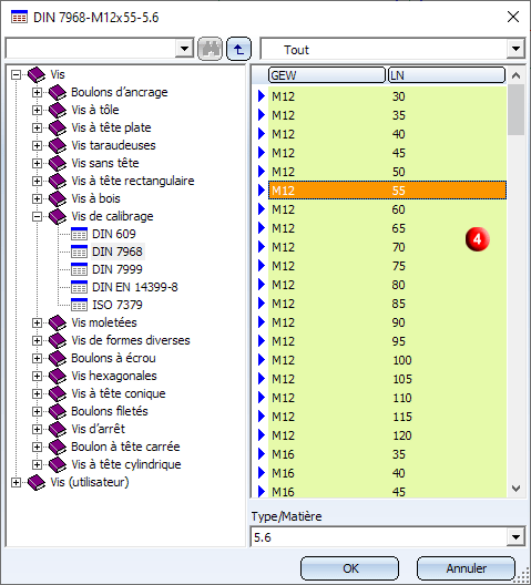 Vous sélectionnez les séries de normes souhaitées de manière analogue en cliquant sur le symbole correspondant. Ensuite, une liste des caractéristiques (4) s'affichera à droite de la fenêtre - ex. GEW (Diamètre de filetage) et LN (Longueur de vis), dans lesquels la pièce standardisée se trouve.