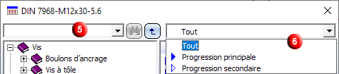 Grâce au Filtre (6), vous avez la possibilité de restreindre la sélection des pièces standardisées affichées. En passant par la boîte de sélection, vous pouvez déterminer si seuls les séries principales ou toutes les séries doivent être affichées. Le paramètre choisi est valable par catalogue et deviendra le paramètre par défaut au prochain lancement du catalogue (même après un redémarrage de HiCAD).