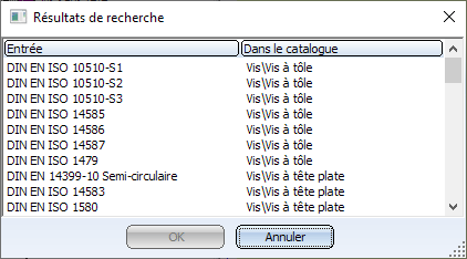 La fenêtre de sélection, affichée une fois la fonction pièce ou usinage standardisés lancée, contient des informations sur le catalogue du type sélectionné de pièce standardisées, tel que le catalogue "Vis", qui s'avère être un sous-catalogue du catalogue "moyen de connexion".