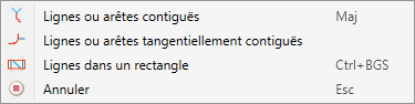 Lignes ou arêtes contiguës Cette fonction recherche, aussi longtemps que la sélection n'est pas ambiguë, toutes les lignes connectées par des courbes, en fonction de la ligne suivante identifiée. Les arrondis seront supprimés et les lignes voisines seront prolongées jusqu'à leur point d'intersection commun. |