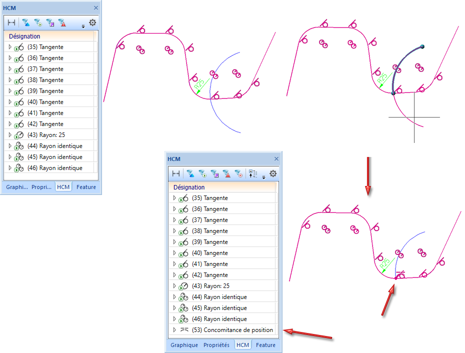 - Des contraintes HCM de type longueur (distance, longueur, angle d'ouverture) peuvent également être harmonisées, par exemple si aucune contrainte de position n'est attribuée.