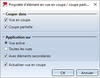 Sous Couper dans, vous déterminez par une coche dans la case si l'élément actif devra être pris en compte dans les vues en coupe/de détail et dans les coupes partielles.