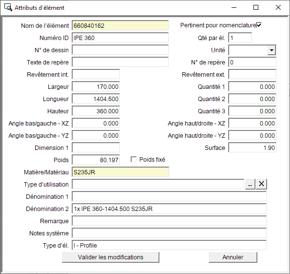 Le masque Attributs d'élément pour les profilés et les tôles de la Charpente métallique est différent de celui des autres éléments 3D. De plus, certains attributs d'éléments seront alloués automatiquement aux éléments de la Charpente métallique, notamment le Numéro ID, le numéro de repère (de position), la longueur, la largeur, la hauteur, le poids, le type d'élément, la pertinence pour nomenclature (oui), etc.