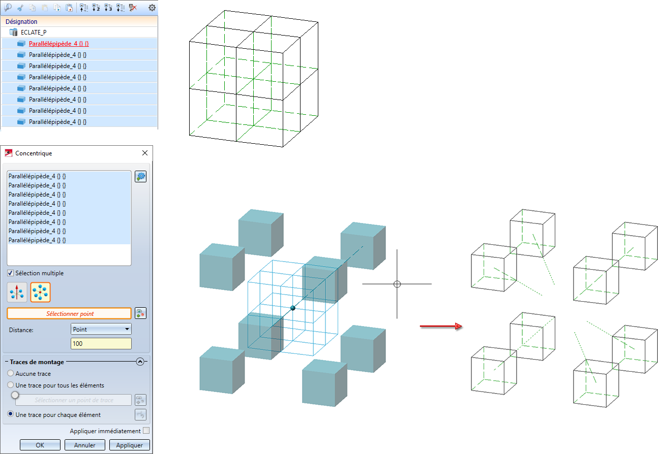 Si la case Appliquer immédiatement est cochée, la transformation sera immédiatement acceptée - comme indiqué dans l'aperçu - et entrée dans le protocole de l'éclaté, c'est-à-dire que vous n'avez pas à cliquer sur le bouton Appliquer. Si d'autres éléments sont sélectionnés immédiatement après - sans modifier les autres paramètres - la même transformation est effectuée immédiatement pour ces éléments sans que ceux-ci n'apparaissent dans la liste de sélection.