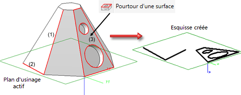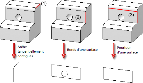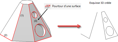 Cette fonction permet de reproduire en une seule fois toutes les arêtes qui forment les bords d'une surface. Sélectionnez la surface de votre choix avec le curseur ou déterminez-la en identifiant deux arêtes. Il peut aussi s'agir des arêtes d'un solide ou d'un élément avec des surfaces libres.