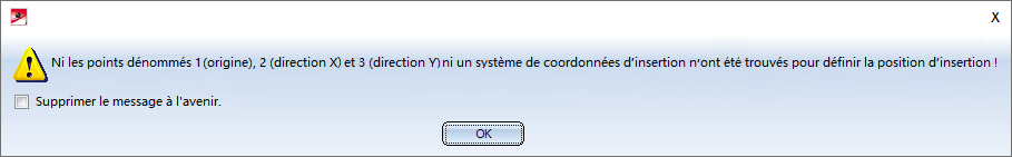 Également les pièces standardisées achetées/d'usine ainsi que les outils de formage seront placés sur la scène au moyen du système de coordonnées d'insertion du fichier KRA correspondant ou au moyen de trois points isolés et dénommés définis dans le fichier KRA (point 1 pour l'origine, point 2 pour la direction X, point 3 pour la direction Y). Si ni ces points ni un système de coordonnées d'insertion n'est encore défini, apparaît alors à partir de HiCAD 2021 le message suivant :