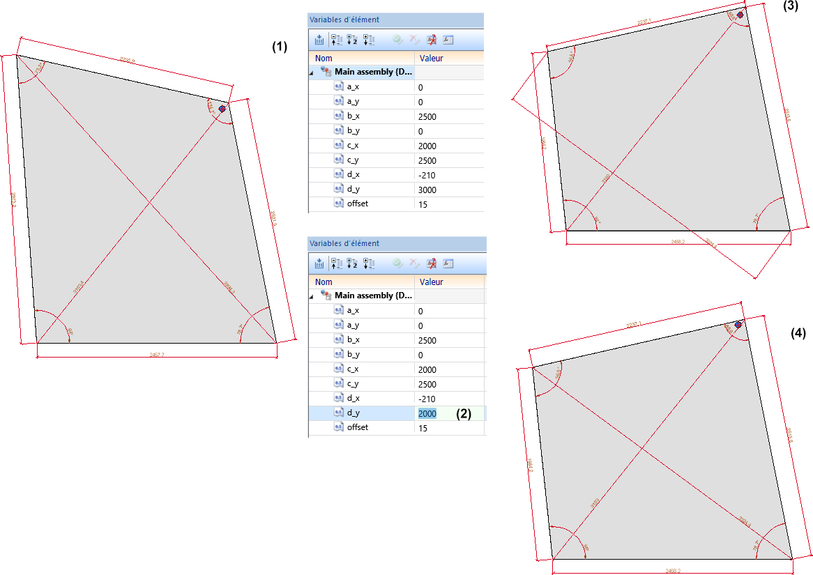 L'image montre un ensemble coté (1) avec plusieurs variables d'élément. On change maintenant la valeur d'une variable, par ex. d_y de 3000 à 2000.