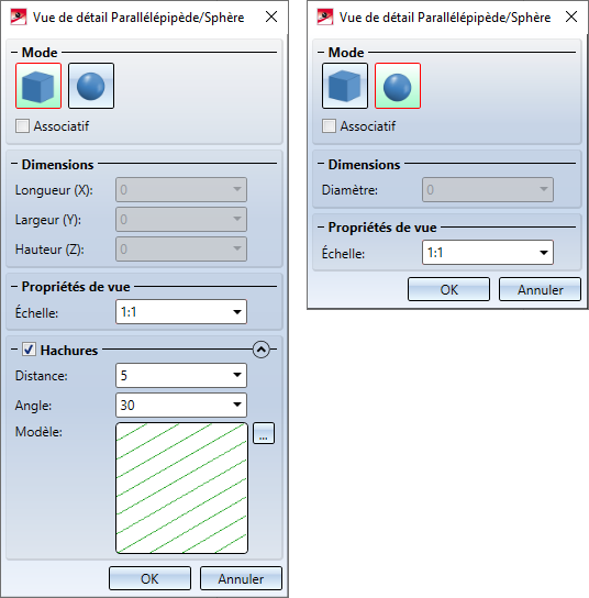 Si une ou plusieurs options de point HiCAD sont utilisées pour déterminer le parallélépipède/la sphère, la case Associatif permet de spécifier comment la vue de détail doit se comporter si les points correspondants sont déplacés par modifications sur la scène.