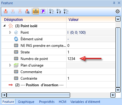 Jusqu'à présent, à l'attribution d'un numéro à un point isolé, un Feature Allouer un numéro de point était inséré dans l'historique de Feature de l'élément correspondant, et ce au même niveau que le Feature Points isolé. Ce mode de fonctionnement a été modifié avec le SP1. À la création d'un point isolé, le paramètre de Feature Numéro de point sera toujours inséré dans le Feature Point isolé. Au moment d'allouer un numéro de point, la valeur du paramètre sera alors corrigée en conséquence. Ce nouveau mode de fonctionnement aboutit à la prise en compte de la suppression des numéros de point lors d'un recalcul de Feature.
