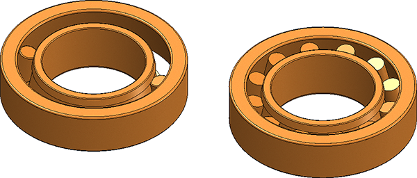 La représentation géométrique des roulements a été améliorée considérablement. Dans une représentation simple comme exacte, tou(te)s les billes / corps tournants sont désormais représenté(e)s. L'augmentation du nombre et de la position des corps tournants permet également d'obtenir une vue en coupe techniquement utile avec une amélioration du hachurage qui est opposé pour l'anneau intérieur et extérieur.