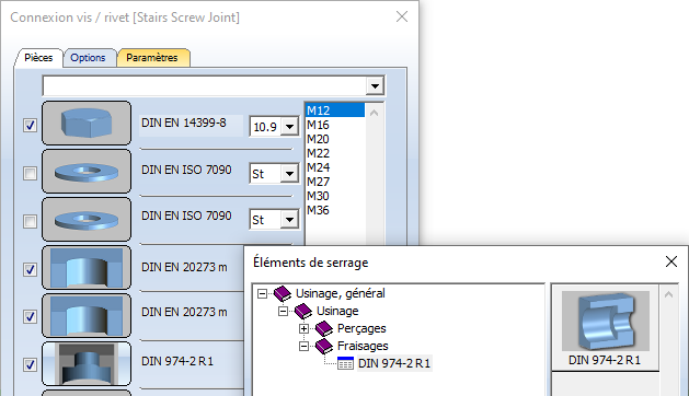 À l'insertion de boulonnages, le fraisage normé correspondant aux vis selon DIN/ISO est désormais disponible.