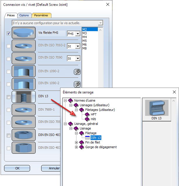 À l'insertion de boulonnages, il est possible à partir du SP1, en fonction du type de vis choisi, de sélectionner également des filetages utilisateur depuis le catalogue Normes d'usine > Usinage (utilisateur) > Filetage (utilisateur).
