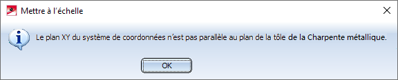 - Si, dans les tôles de la charpente métallique, le plan XY de la mise à l'échelle ne concorde pas avec le plan de la tôle, apparaît alors un message d'erreur.