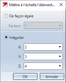 Cette fonction modifie l'échelle de l'élément actif/la liste d'éléments active en saisissant des facteurs d'échelle, de manière égale ou inégale. Un Feature sera créé à cette occasion.