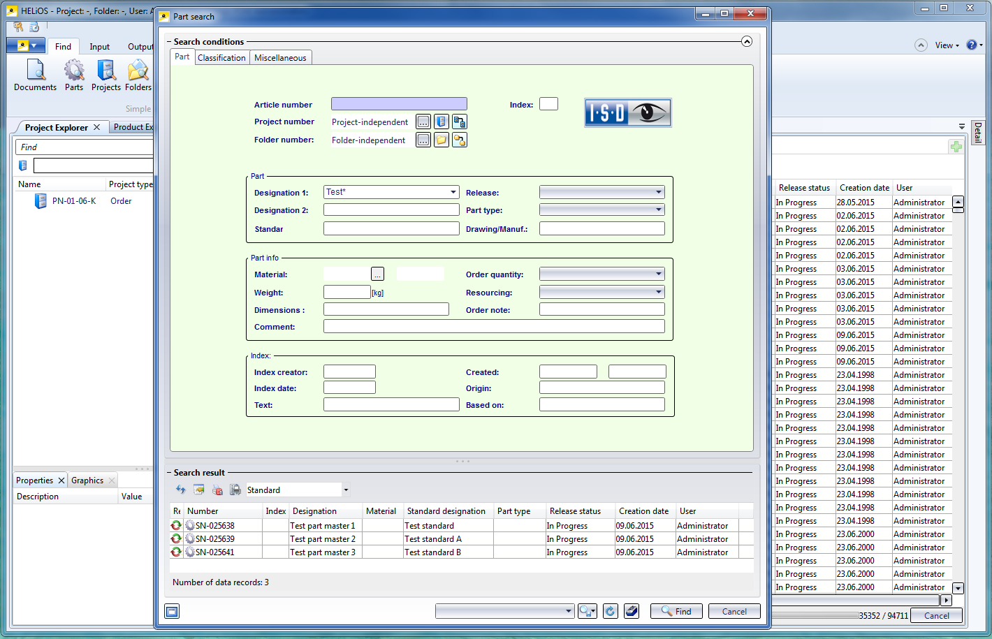 First, start the HELiOS Desktop and create, via a targeted article search with suitable search criteria, a result list containing the article masters that you want to use for the part variant. Please leave this window open, as you will need it again later.