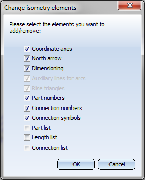 When the dialogue opens, all checkboxes for the elements which are already available in the drawing will be activated. To add or remove elements, activate or deactivate the corresponding checkbox and confirm withOK. This enables you, for example, to change dimensioning settings or itemisation settings without "losing" the entire drawing each time.