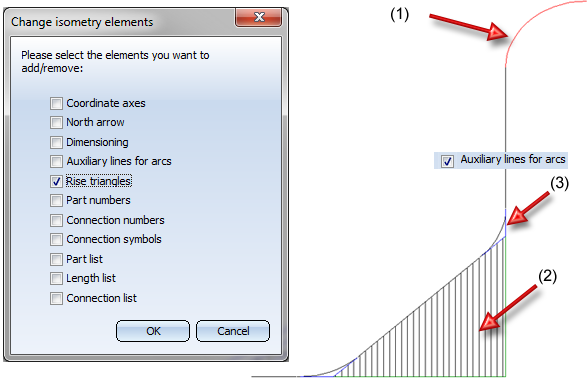 Separate auxiliary lines can be assigned to rise triangles. In this way you can , for example, hide auxiliary lines for arcs, but still show auxiliary lines for rise triangles in isometric drawings. In particular, the auxiliary lines on rise triangles will be hidden or shown depending on the visibility of the rise triangles.