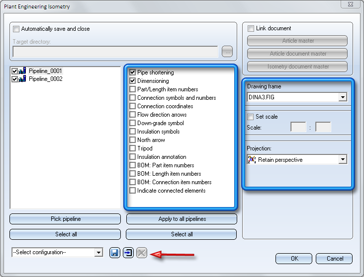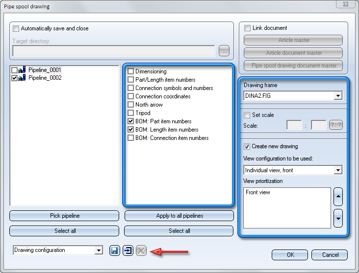 The settings specified for this pipeline will be saved, together with the drawing, for each pipeline of the drawing when the isometry or the pipe spool drawing is saved. These are the so-called drawing configurations.