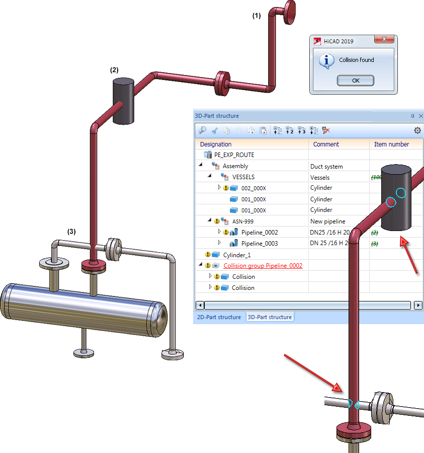 In the image below the Pipeline (1) collides with the Cylinder (2) and the Pipeline (3). If you carry out the collision check, there will be 2 collision parts in the Collision group.