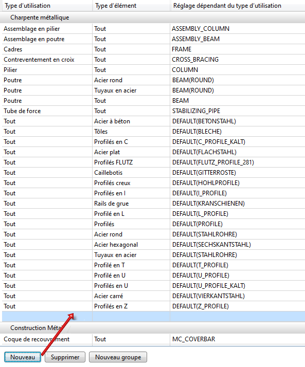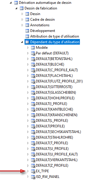 La liste des types d'utilisation du Gestionnaire de Configuration peut être complétée d'autres attributions sous Dérivation automatique de dessin > Dessin de fabrication > Attribution de type d'utilisation, il est possible notamment de définir ses propres réglages dépendant du type d'utilisation.