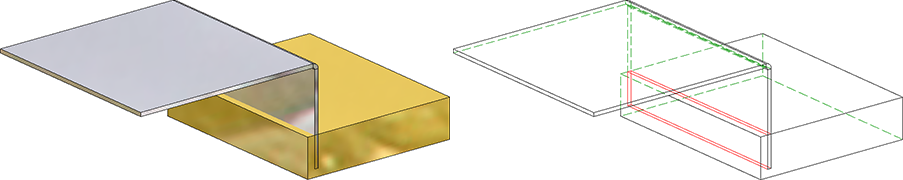 Dans l'illustration suivante, la tôle pliée, plus précisément le rabat de tôle, entre en collision avec le parallélépipède.