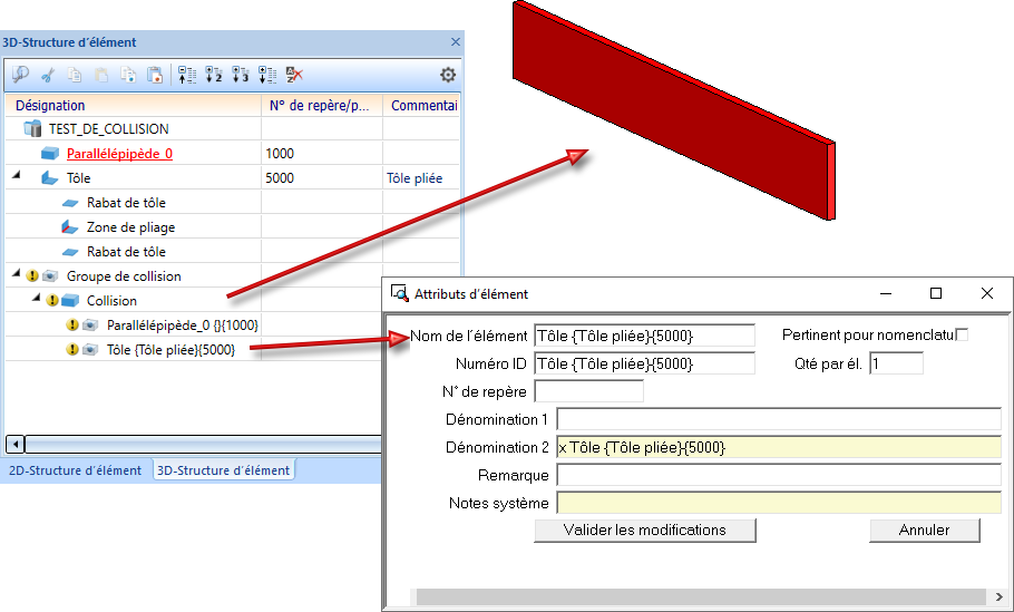 Pour chaque collision constatée, un Élément de Collision de type Solide est généré avec la géométrie de la collision. Celui-ci comprend l'élément "en copie" des deux éléments provoquant la collision. Ces copies sont des éléments vides qui ne possèdent pas de géométrie et uniquement quelques attributs d'élément. Ces deux éléments vides servent à identifier par leur nom les éléments qui provoquent la collision. Cela permet de clarifier plus rapidement la cause de la collision, étant donné que l'élément de la collision peut être très petit et donc souvent difficilement visible. Le nom et le numéro ID de ces éléments vides seront généralement le nom de l'élément d'origine affiché dans l'ICN, y compris le numéro de repère et le commentaire. Les éléments de collision qui ne sont pas de vrais éléments font exception. Dans ce cas, tous les éléments de collision sont à nouveau regroupés sous le nom de Groupe de collision. Pour l'élément vide, le nom de l'élément supérieur est utilisé. Cela s'applique aux filetages, aux rabats de tôle, aux zones de pliage et aux éléments secondaires des profilés de série.