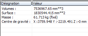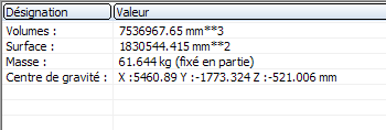 Détermine l'aire d'une surface, le volume et la masse de l'élément actif. Veuillez noter que la masse dépend du matériau attribué.