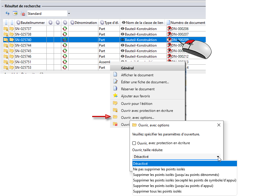 Si vous avez sélectionné plus de fichiers dans la liste de résultat que ce que peut ouvrir HiCAD, vous pourrez alors ouvrir le reste des fichiers par la suite sans avoir à les sélectionner de nouveau. Utilisez pour cela la fonction Réinitialiser du menu déroulant de Fiche de doc. .