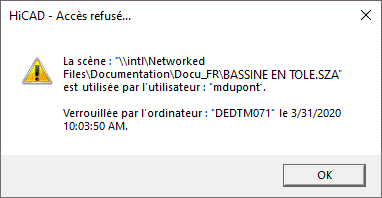 Si vous ne cochez pas la case Ouvrir la scène en lecture seule et que vous cliquez sur Ouvrir, un message d'erreur HiCAD s'affiche alors :