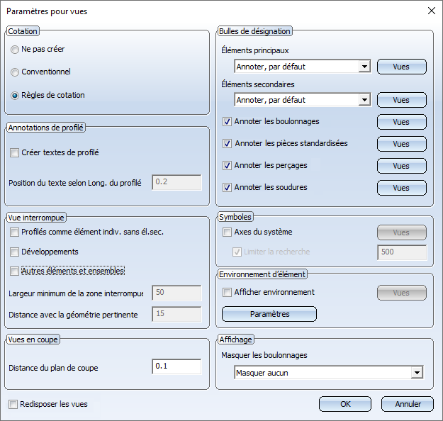 L'affichage peut être spécifié séparément pour les vues standards, les vues en coupe et les vues axonométriques. Les valeurs par défaut sont :