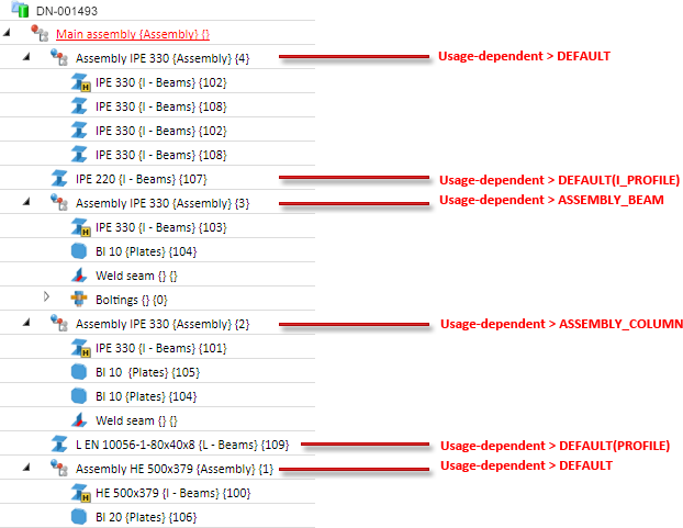 In this case, the settings from the file BIM_WSD_Column assembly.DAT will be used for all assemblies with the usage Column assembly; for all other assemblies, the settings from the default files will be used, i.e. the settings from the file BIM_WSD_Default_Assembly.DAT for general assemblies, and the settings from the files BIM_WSD_Default_Bolted_Assembly.DAT or BIM_WSD_Default_Welded_Assembly.DAT, respectively, for bolted assemblies or welded assemblies, respectively.