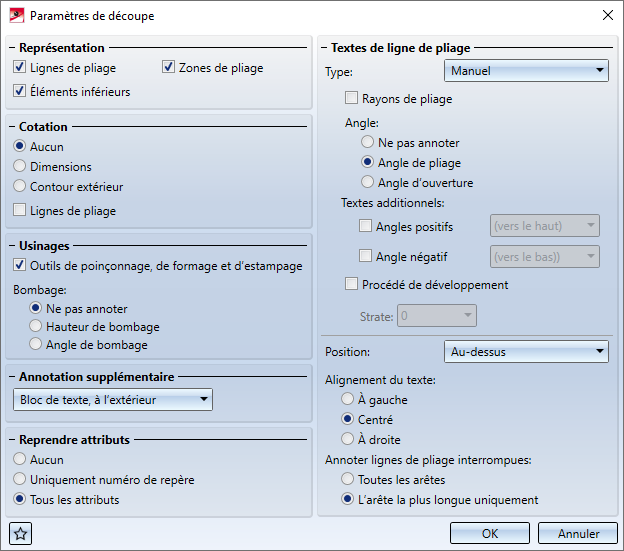 Cochez dans la fenêtre de dialogue les cases des paramètres qui doivent être activés dans la découpe.