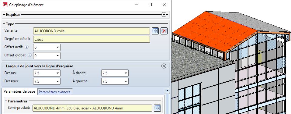 Procédez pour finir au calepinage du toit. Ouvrez à nouveau le Calepinage d'élément et sélectionnez l'esquisse (3). Nous voulons occuper toutes les zones de l'esquisse, il suffit donc de sélectionner la variante des éléments de calepinage (ALUCOBOND collé) et de redéfinir l'offset sur 0. Exécutez le calepinage en quittant la fenêtre par OK.