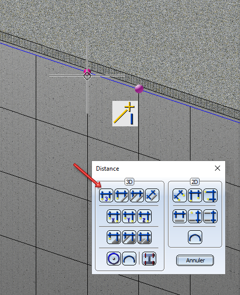 Nous voulons occuper l'arête d'éléments angulaire, nous choisissons donc ici comme jonction à gauche l'exécution Coin extérieur plié. Appliquez comme longueur du pli une longueur de la scène. Cliquez sur le bouton droit de la souris dans le champ Longueur et sélectionnez dans le menu contextuel la fonction Élaborer la distance puis la fonction Distance, 2 points. Ensuite, identifiez 2 points de grille limitrophes de l'esquisse 2 (avec l'auto-pilote, Option de point I).