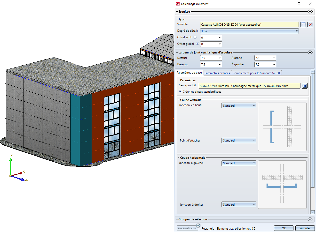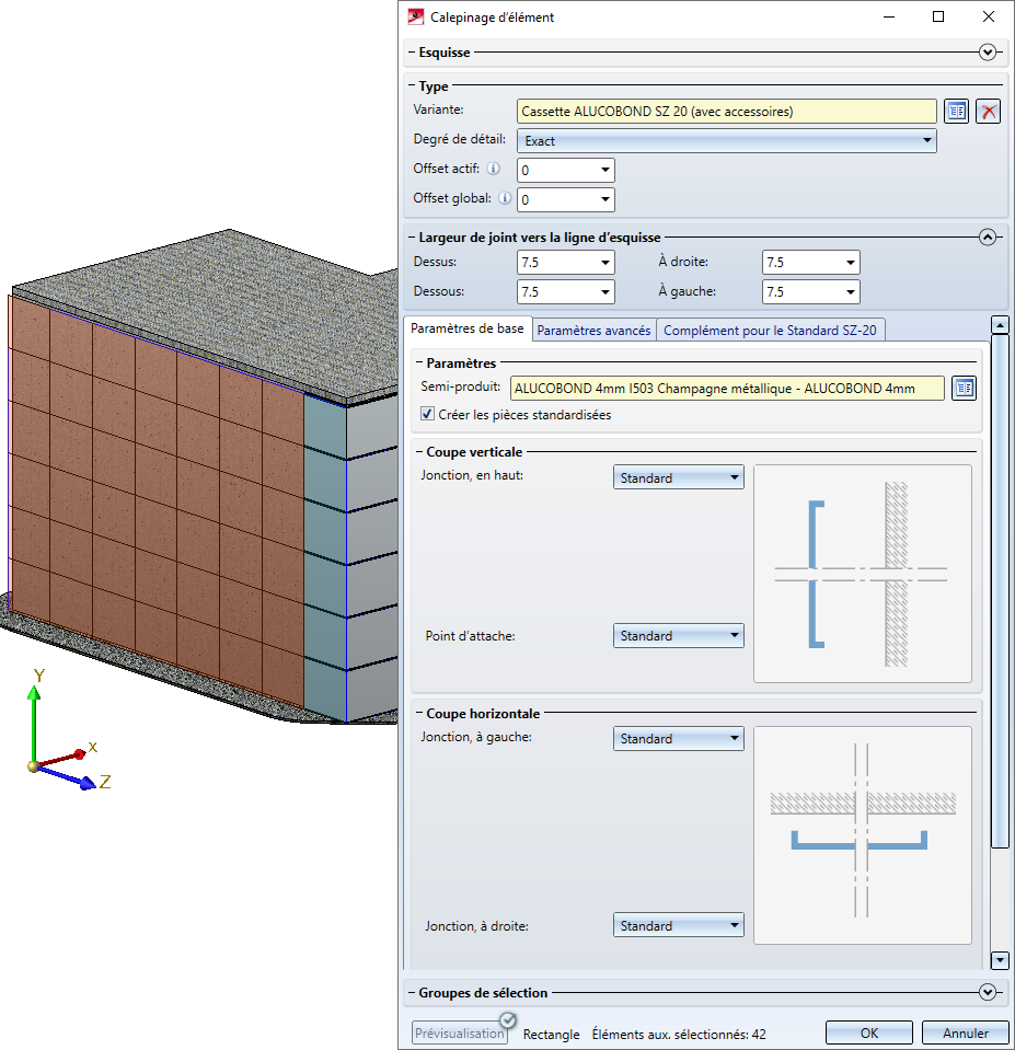 Sélectionnez ici également ALUCOBOND SZ20 et appliquez par OK les paramètres standards. Un 2e ensemble est créé avec le nom Calepinage d'élément.