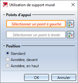 D'un point de vue plus technique, en choisissant À droite dans le champ Position pour profilé présent dans la fenêtre de dialogue Support mural, la position des support muraux est déplacée horizontalement vers la droite dans la direction Y, entre le système de coordonnées d'insertion du profilé et le point d'appui. Cela s'applique de manière analogue choisissant À gauche. En position centrale, aucun déplacement ne sera mené mais les supports muraux seront placés sur l'axe.