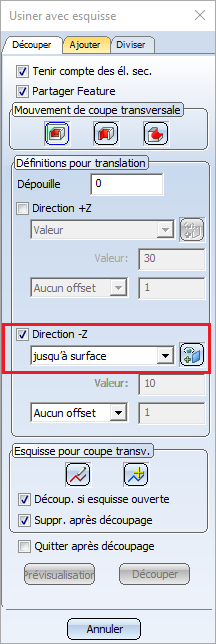 On souhaite ici procéder à un découpage dans le support de montage (en vert) afin de pouvoir y insérer la languette (en bleu et transparente). On utilise pour ce faire la fonction Découper élément, avec translation. Ce découpage doit donc être adapté au positionnement de la languette. Pour définir la profondeur de découpage adaptée, on sélectionne donc la fonction jusqu’à surface ainsi que la surface de la face arrière de la languette.